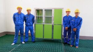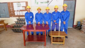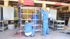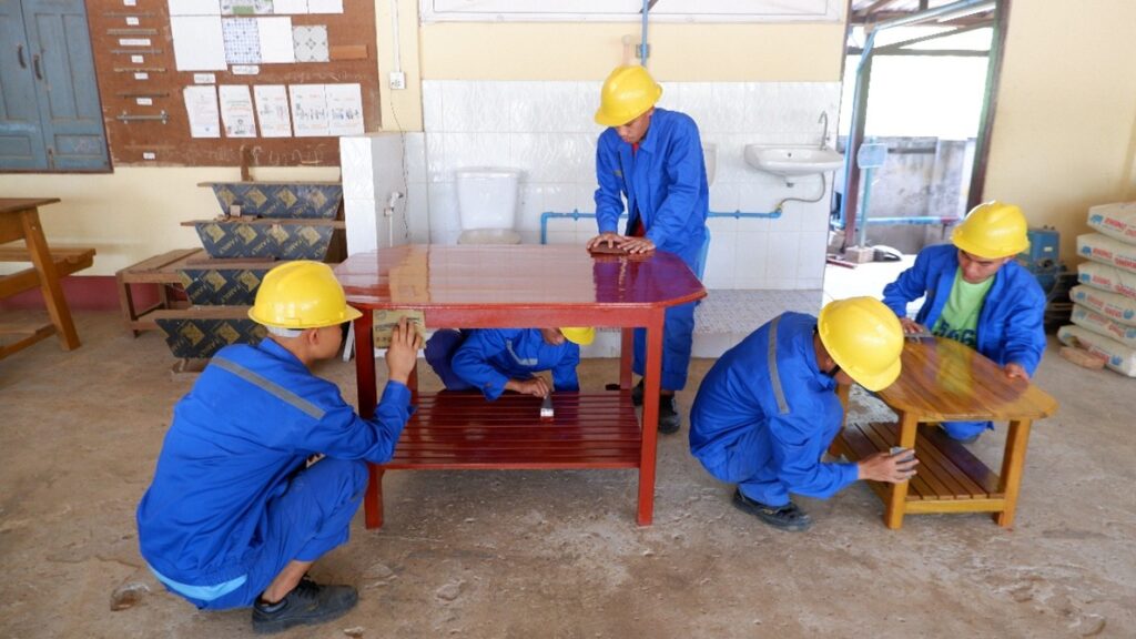 建設科・溶接科では家具製作、電気科は校内のエアコンや天井扇風機の修理・保守、自動車整備科は外部から持ち込まれた車両の点検・修理を担当しました。